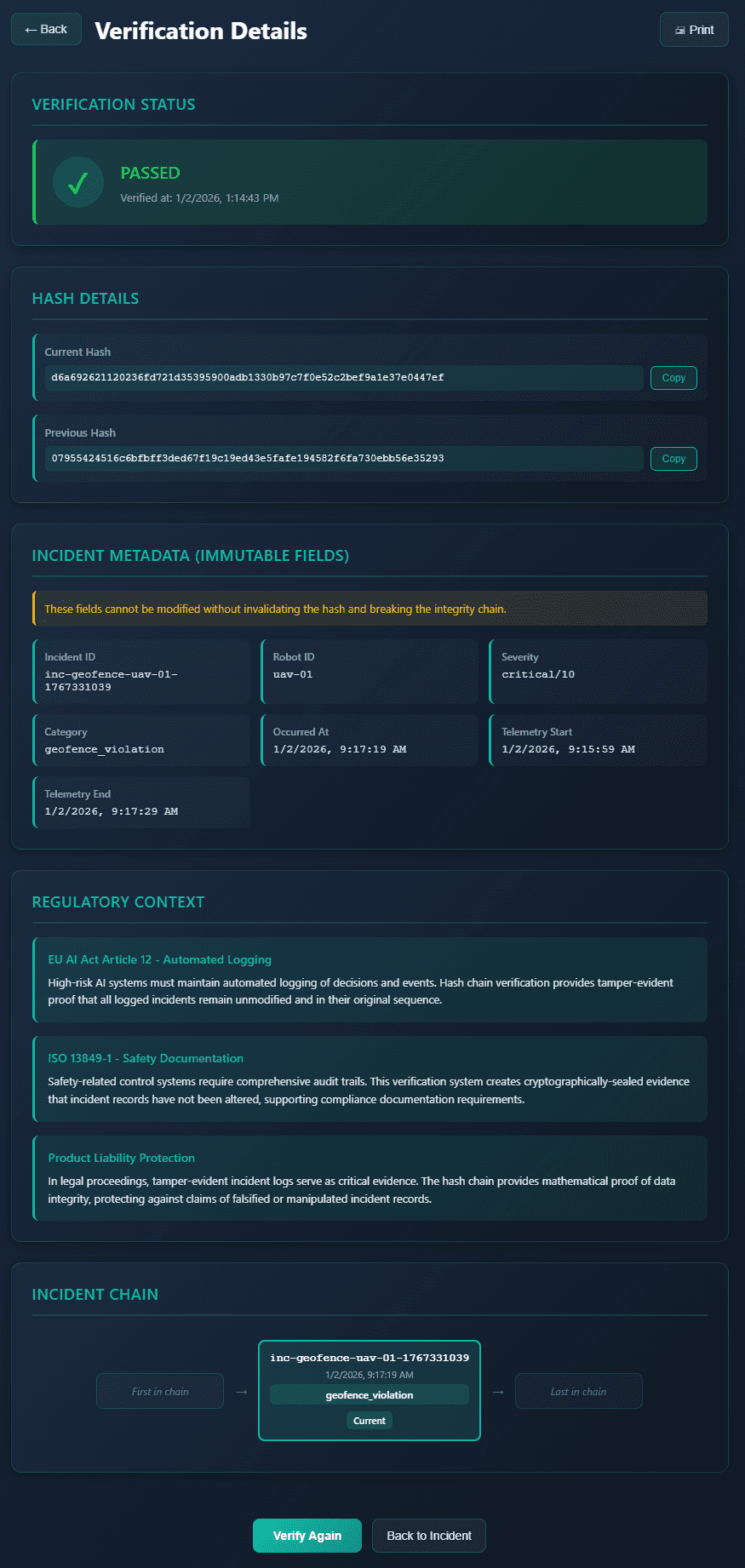 Support EU AI Act obligations. Provide evidence for ISO 13849 audits. Defend liability claims with verifiable, audit-ready records