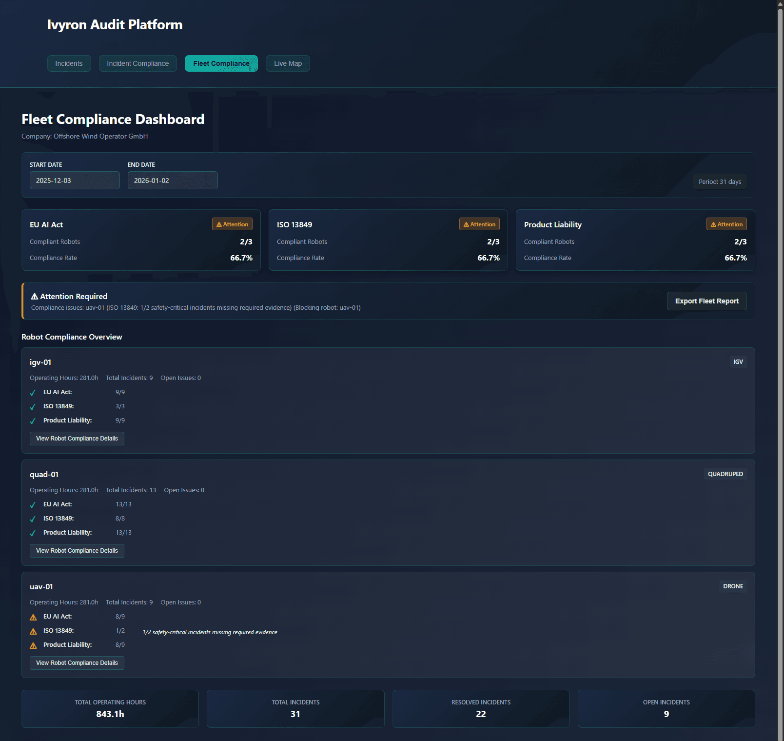 Ivyron Audit is a compliance-focused audit system designed to capture, preserve, and present incident-level evidence for autonomous robots operating in regulated environments.